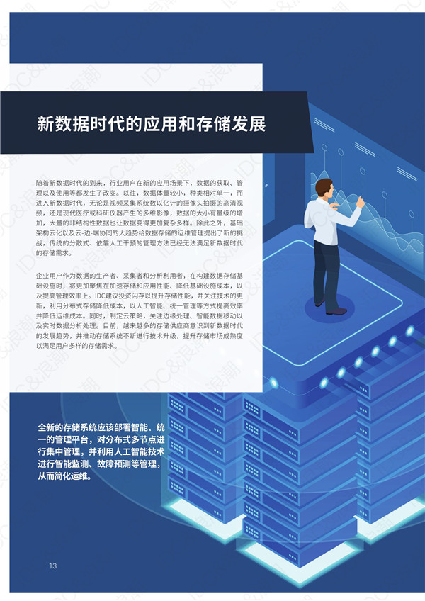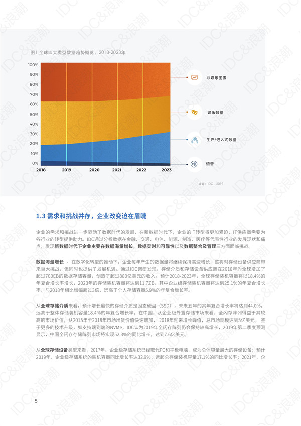 報告顯示,在2019年中國數(shù)字化轉(zhuǎn)型IT支出首次超過非數(shù)字化轉(zhuǎn)型IT支出,占比達到51%。隨著數(shù)字化轉(zhuǎn)型的不斷加速,行業(yè)新應(yīng)用從數(shù)千、數(shù)萬躍升到百萬量級,數(shù)據(jù)呈現(xiàn)出海量、多元、實時、多云等趨勢。數(shù)據(jù)存儲成為承載產(chǎn)業(yè)轉(zhuǎn)型的基礎(chǔ)平臺,分布式存儲成為趨勢,2023年其占比將達到40%,閃存陣列將迎來高速發(fā)展。