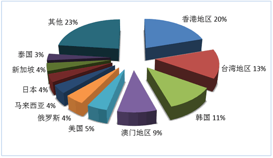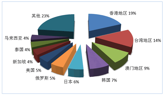第三季度旅行社入境旅游外聯(lián)人次排名前十位的客源地國(guó)家或地區(qū)由高到低依次為香港地區(qū)、臺(tái)灣地區(qū)、澳門地區(qū)、韓國(guó)、日本、俄羅斯、美國(guó)、新加坡、泰國(guó)、馬來(lái)西亞(見(jiàn)圖1)。