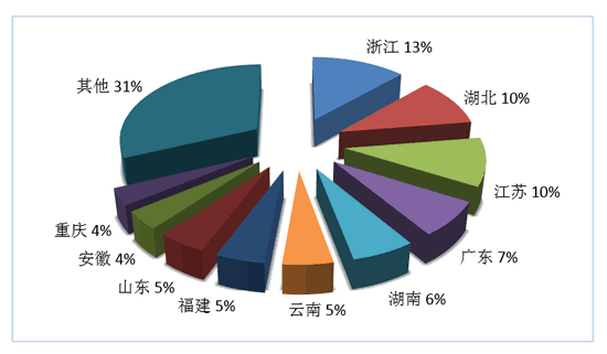 第三季度旅行社國(guó)內(nèi)旅游接待人次排名前十位的地區(qū)由高到低依次為浙江、湖北、江蘇、廣東、湖南、云南、福建、山東、安徽、重慶(見(jiàn)圖4)。