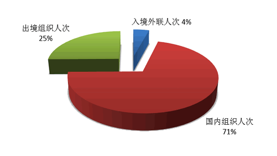 按照入境外聯(lián)人次、國(guó)內(nèi)組織人次、出境組織人次三項(xiàng)指標(biāo),入境旅游、國(guó)內(nèi)旅游、出境旅游市場(chǎng)人次所占份額依次為4%、71%和25%(見(jiàn)圖6)。